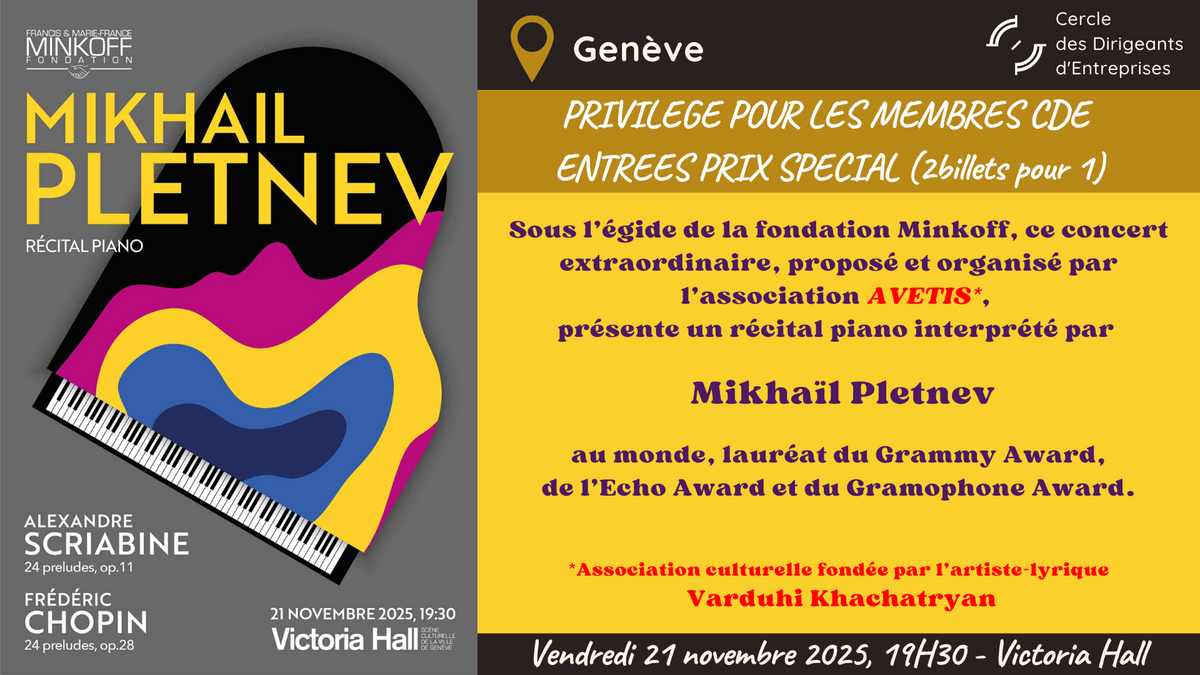J’ai le plaisir de vous inviter au concert extraordinaire du grand pianiste Mikhaïl Pletnev, l’un des plus grands pianistes du monde, lauréat du Grammy Award, de l’Echo Award et du Gramophone Award. Le concert aura lieu le 21 novembre 2025 au Victoria Hall. Je serai très heureuse de vous retrouver à cet événement exceptionnel, organisé par notre association AVETIS.