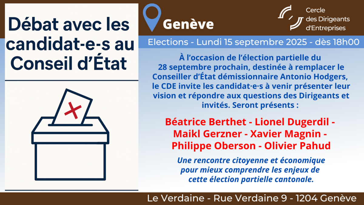 À l’occasion de l’élection partielle du 28 septembre destinée à remplacer le Conseiller d’État démissionnaire Antonio Hodgers, le CDE invite les candidat·e·s à venir présenter leur vision et répondre aux questions des dirigeants.