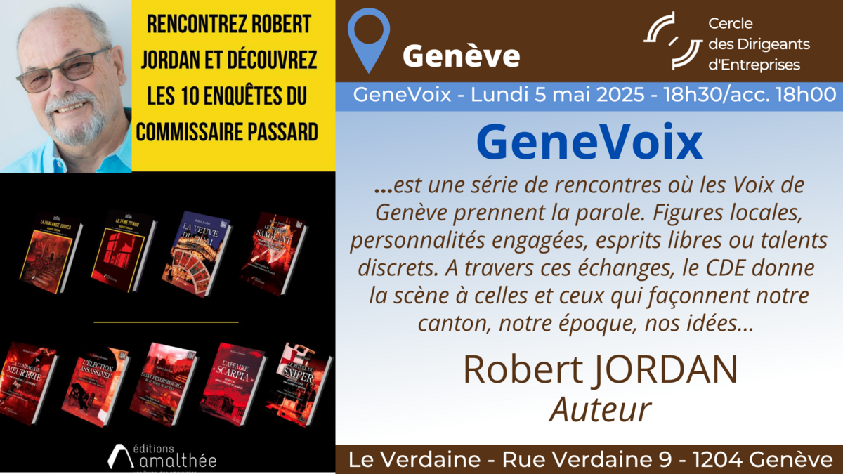 Notre premier invité, Robert Jordan, en est un bel exemple : technicien au Grand Théâtre, devenu entrepreneur, puis auteur de dix romans policiers. Un parcours inattendu, riche, profondément humain — exactement ce que GeneVoix souhaite mettre en lumière.
