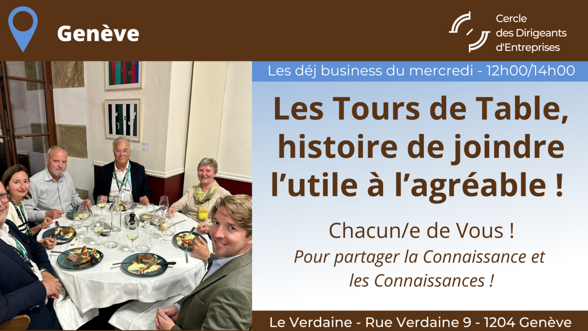 C'est pourquoi, ces "tours-de-table", ces déj-business et partages, sont proposés chaque semaine afin de toujours mieux interagir entre membres, anciens, nouveaux et... futurs, pourquoi pas ? Autour d'une table-déjeunatoire, voici une nouvelle manière de présenter ses activités, ses idées, ses projets !